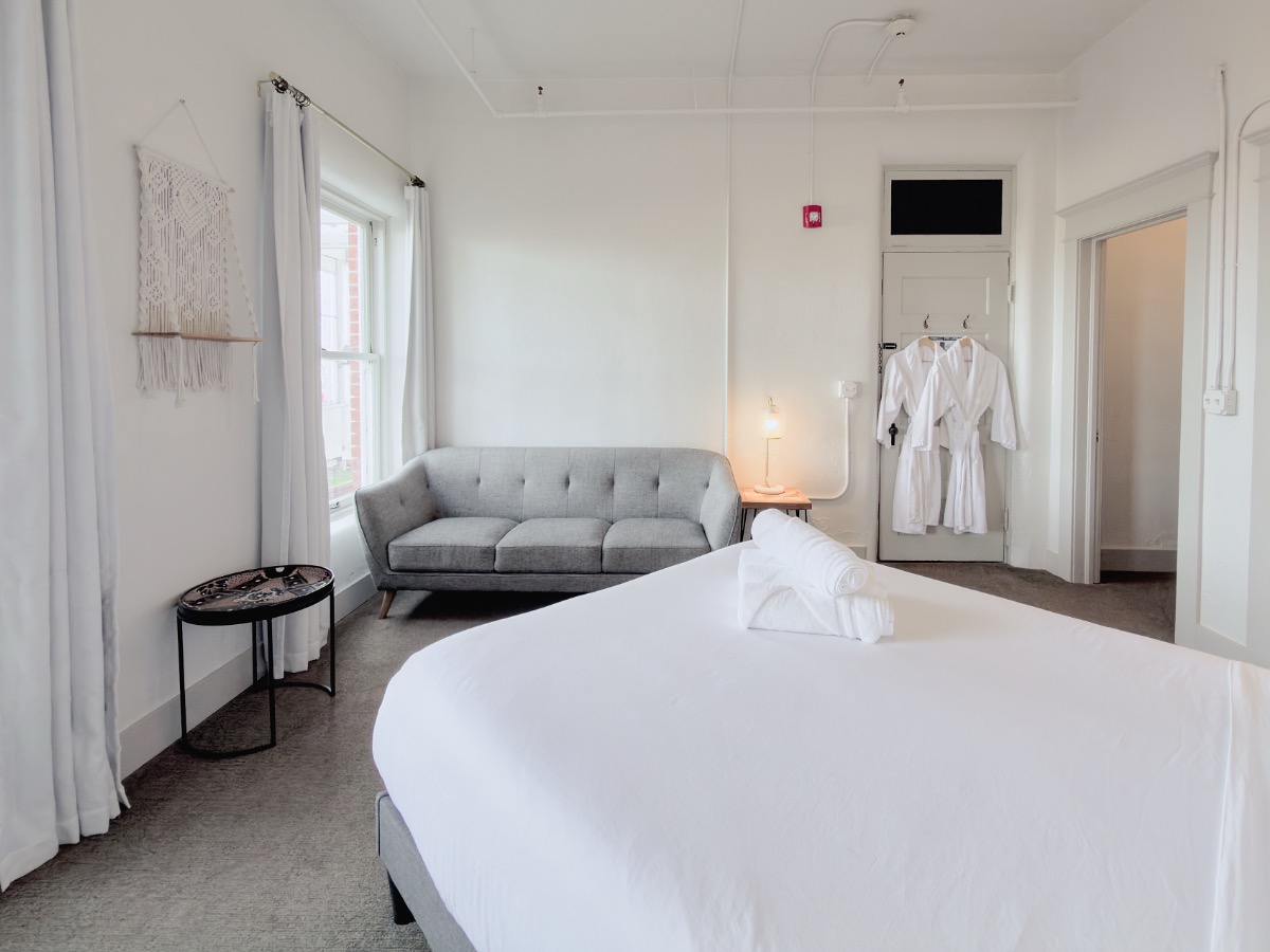 The room retains authentic historic charm—think century-old windows and doors—while offering modern comfort with portable air conditioning in summer. Sound travels easily in the historic building, so please keep voices low at night and early mornings.