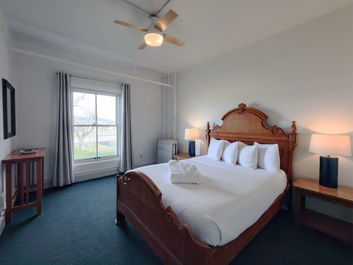 The room retains authentic historic charm—think century-old windows and doors—while offering modern comfort with portable air conditioning in summer. Sound travels easily in the historic building, so please keep voices low at night and early mornings.