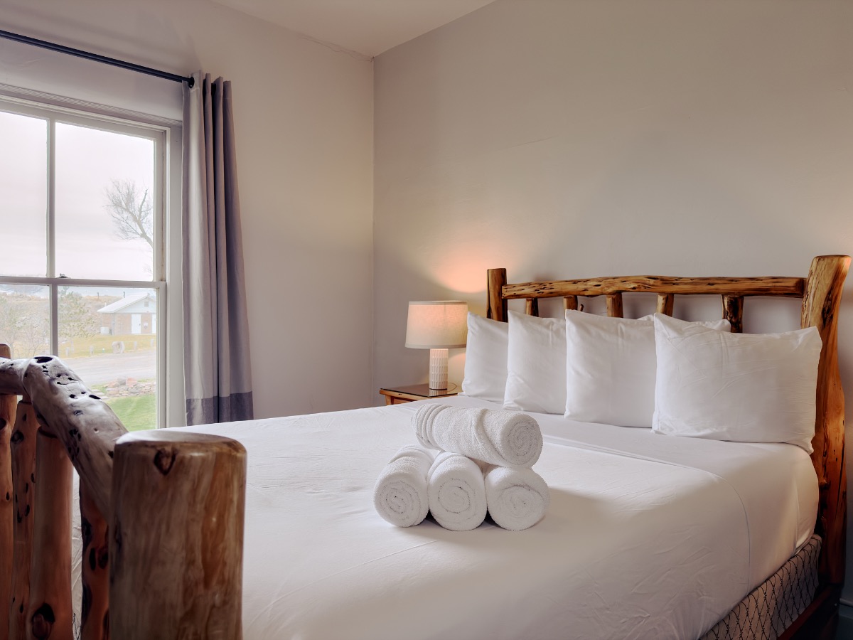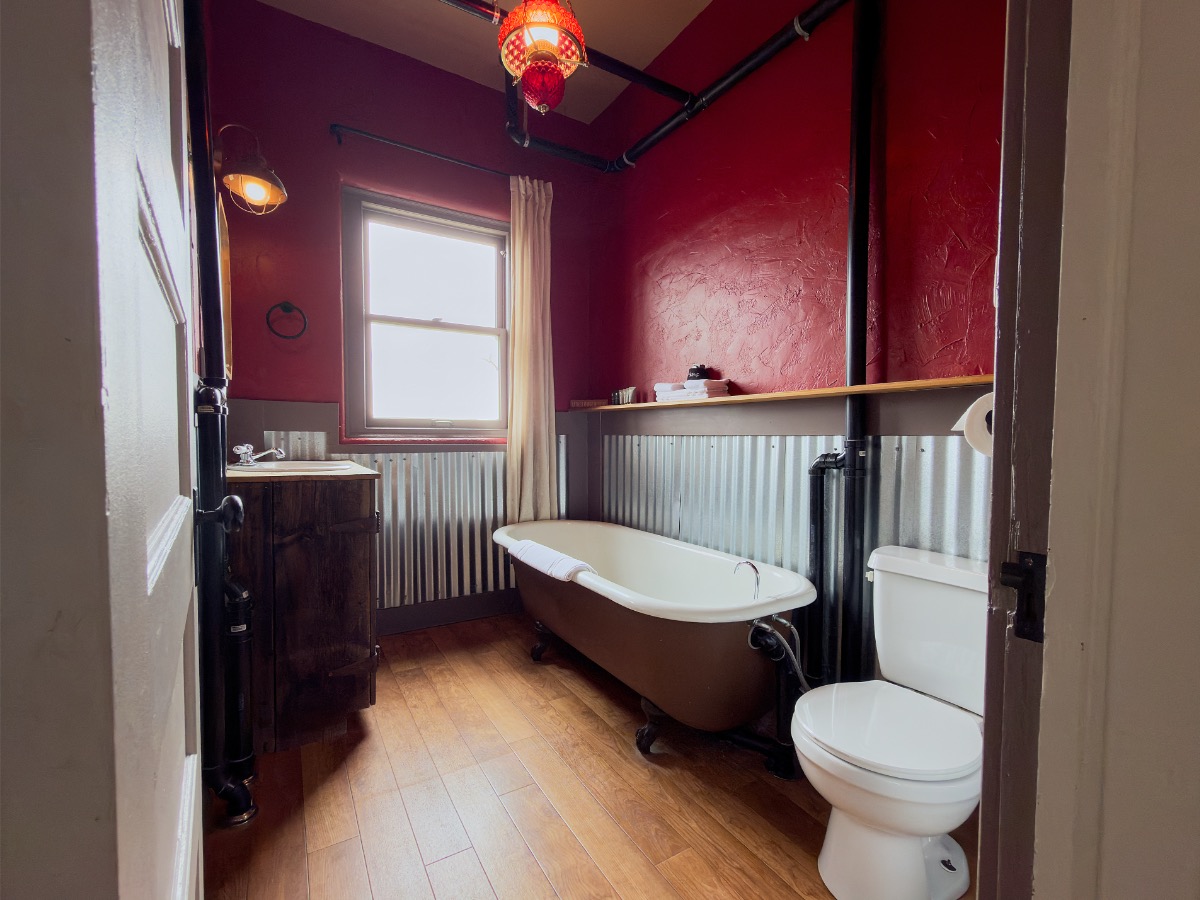 Room 207 is a spacious two-room stay on the second floor of Hot Lake Springs Resort, featuring two separate bedrooms (each with a Queen bed) and a classic clawfoot soaking tub in the private bathroom (no shower). A laptop-friendly workspace adds convenience for light work or planning your day, making it ideal for small groups with historic details and modern comfort.